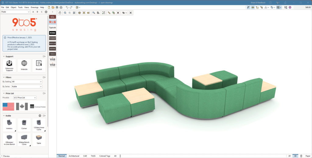 Design services are available now. Upload project basics (plan files, goals, timeline) to the Design Request Form at 9to5seating.com/koble-request or email designkoble@9to5seating.com.